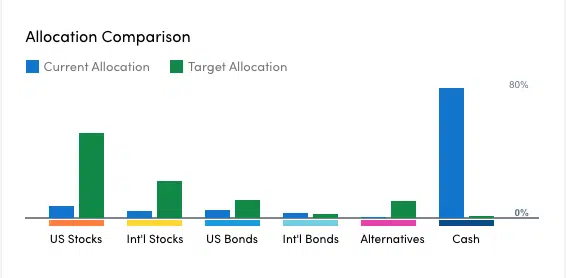 If you look at my actual liquid asset allocation vs. what a top fintech money manager says I should target, you can see how their advice (green bars) is the exact opposite of my strategy.