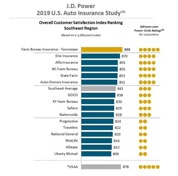 We’re using the J.D. Power U.S. Auto Insurance Study, released in June 2019. More specifically, we’ve relied on the Overall Customer Satisfaction Index Ranking – Southeast Region, which includes North Carolina.