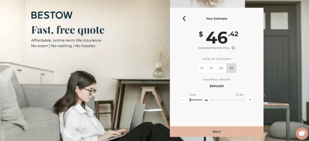 Term life insurance from Bestow can last for anywhere from 10 to 30 years, and coverage amounts are available from $50,000 to $1.5 million. Potential customers can tailor their coverage to their unique needs, buying only the amount of coverage they want.