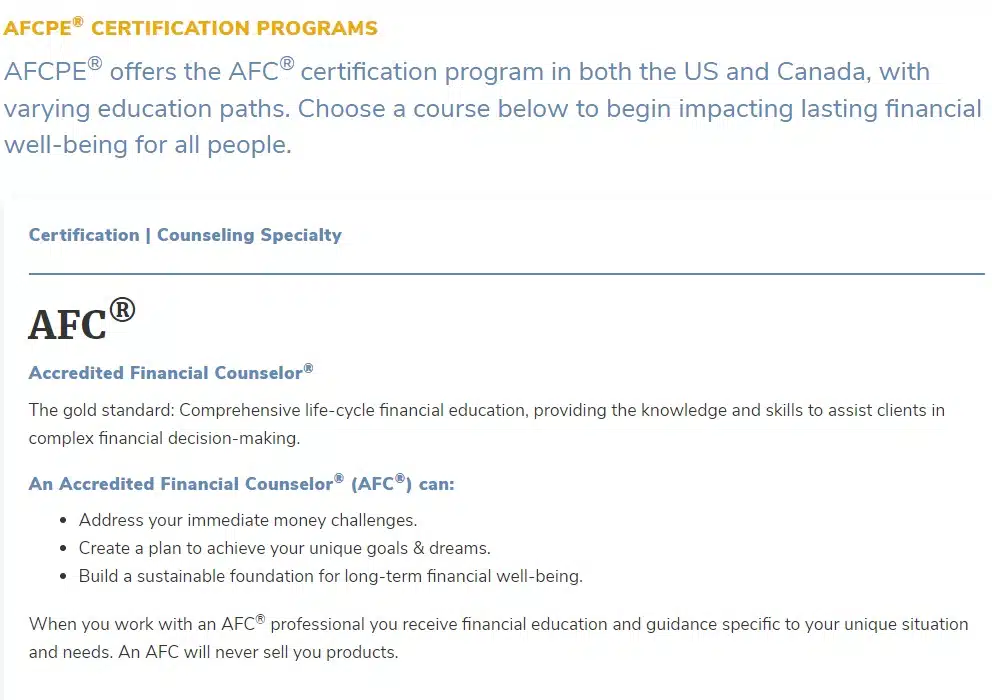 For example, financial coaches can participate in training with the Association for Financial Counseling & Planning Education (AFCPE) to earn their Accredited Financial Counselor® (AFC®) certification.
