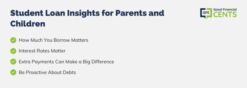 With all of this in mind, I feel very strongly that parents should counsel their kids about all types of debt, including student loan debt. Parents need to feel especially comfortable discussing the financial sacrifices involved in funding college with their kids, including who is ultimately going to pay the bill. If the student is going to have to repay the entire balance, they should know that ahead of time. Likewise, parents should be honest and upfront about how much they’re able and willing to help.