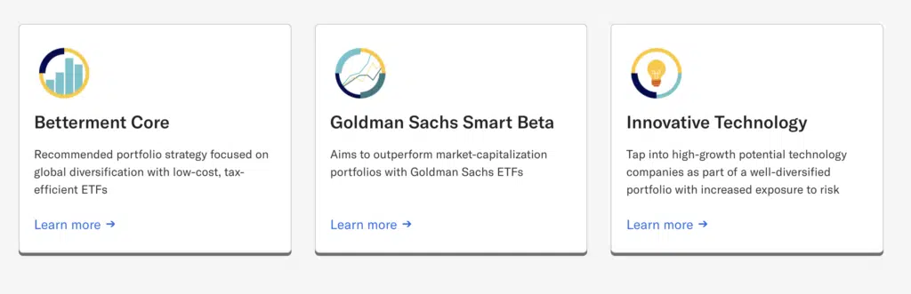 Currently, they offer a variety of investing options with their Betterment Core, Goldman Sachs Smart Beta, and Innovative Technology portfolios: