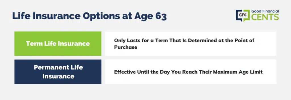 Despite what one may believe, there are multiple options available for those who are age sixty-three. The most popular option is term insurance coverage, but you might have the option to buy permanent coverage as well.