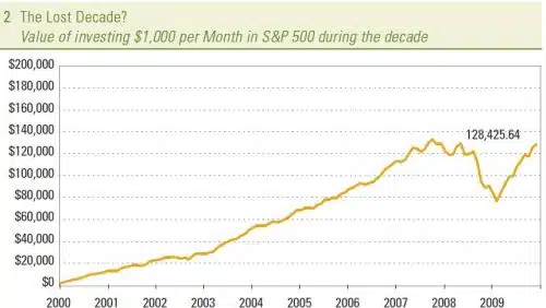 For those that consistently invested $1,000 per month in the S&P 500 the decade produced a modest gain of over $8,000 instead of an $11,000 loss.