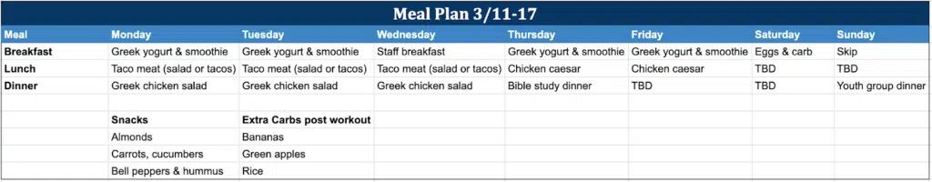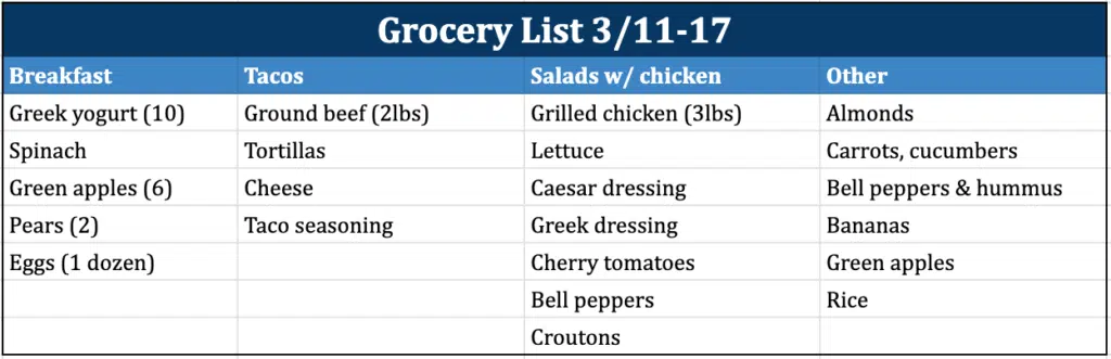 We actually put our meal plan into a Google spreadsheet so we can see exactly what we’ll be eating. Then, we put together a grocery list of everything we need to buy that week. We usually try to stock up on some healthy snacks as well.