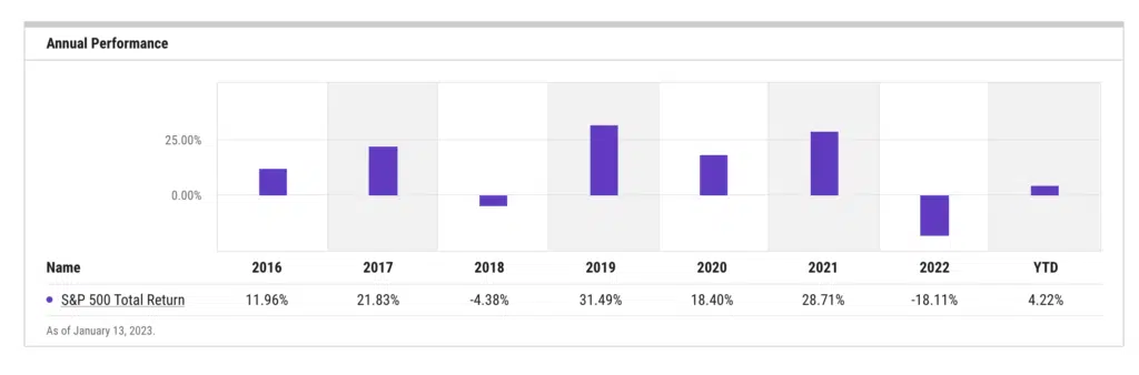 For 2019, the S&P 500 was up 28.88%; in 2020, up 16.26%; in 2021 it was up 28.71%; in 2022 finished down -18.11%, and 2023 finished strong up 24.24%.