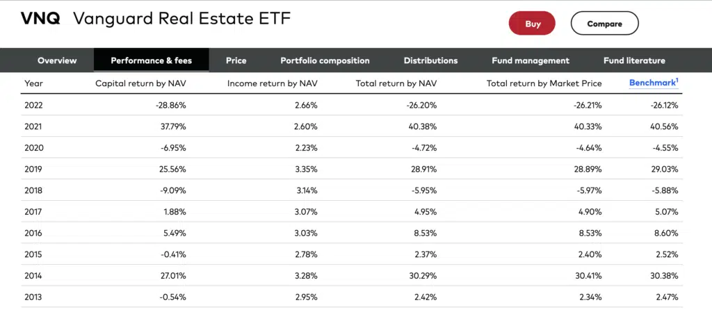 | Year | My Fundrise Returns | Vanguard Real Estate ETF (VNQ) Returns |