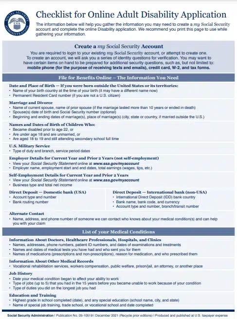 Fortunately, the U.S. Social Security Administration offers its own Adult Disability Checklist that can help you gather the necessary information to apply.