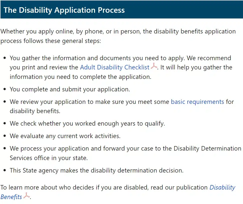 There are several different steps involved in applying for Social Security disability, although you may not have to complete all of them to qualify. The following outline explains each step of the process, along with what to expect along the way.