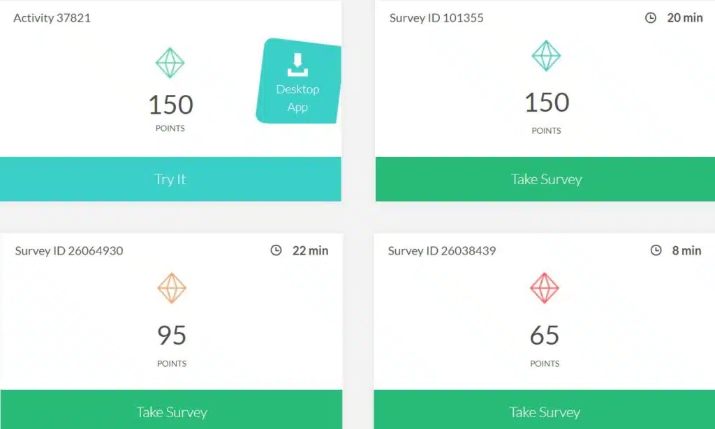 Once your account is set up, you’ll be shown an array of surveys you can qualify for, with varying levels of points assigned to each. Fortunately, each survey you take clearly displays how many points you can earn, so you can decide if it’s worth it. Most surveys also have an estimated time for completion listed, which is another metric you can use to decide which surveys to take.