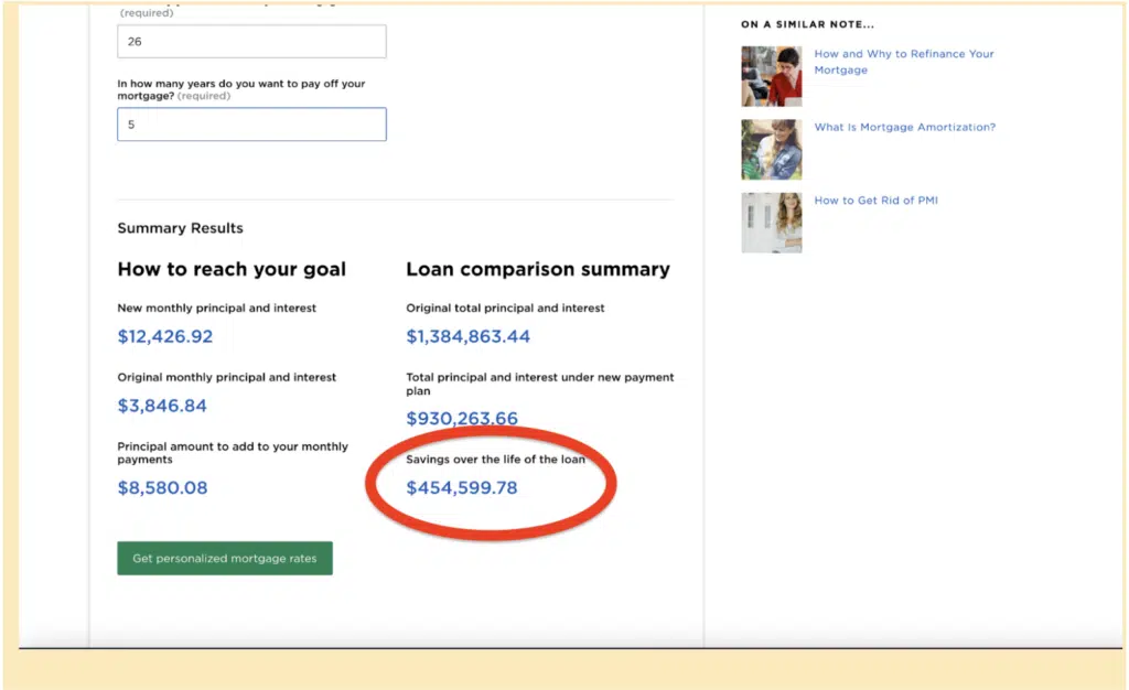 If we take this step and pay an additional $8,580 toward our mortgage each month after making the $100,000 lump sum payment, we should save $454,599.78 in interest on our home loan!