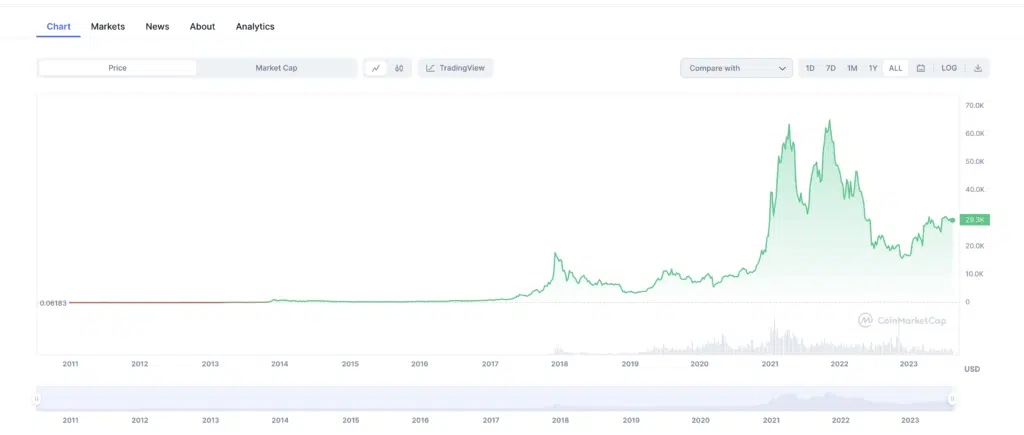 The price of Bitcoin has been extremely volatile over time. Here’s a 10-year price history from the cryptocurrency tracking site CoinMarketCap.